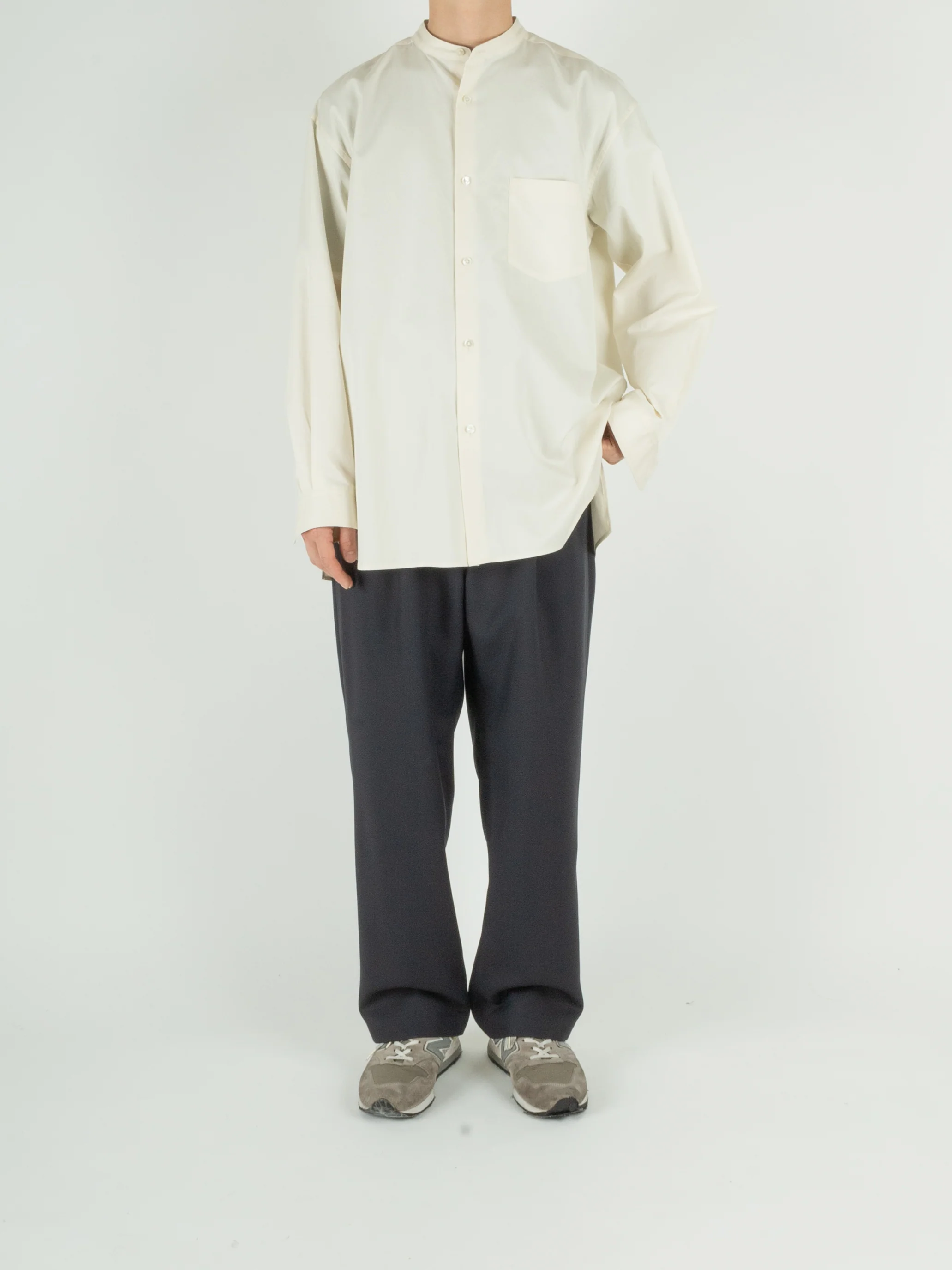 フィンクスコットン原料を使用した高密度ツイル素材のバンドカラーシャツ。